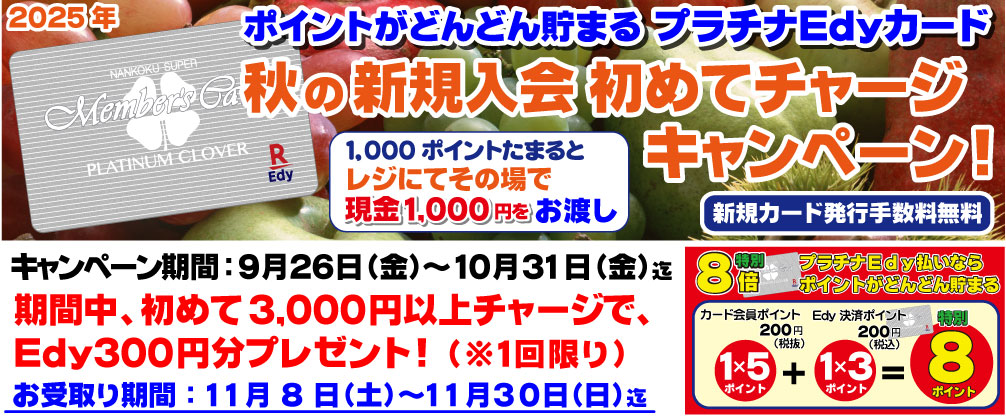 ナンコクスーパーのポイントカードは、プラチナEdyカードのみご利用頂けます。